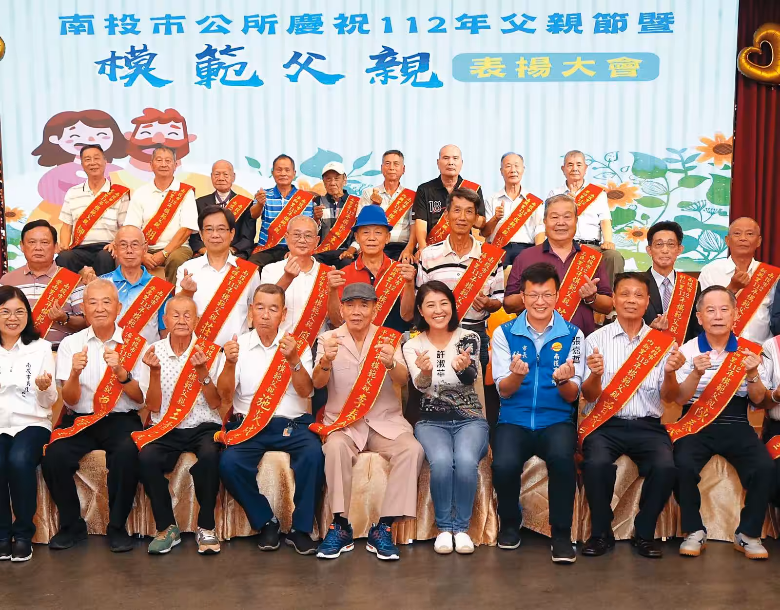 ▲前年8月南投縣長許淑華在模範父親表揚大會致詞時,要張嘉哲快點生孩子,間接證實他已婚的傳言。(翻攝張嘉哲臉書)