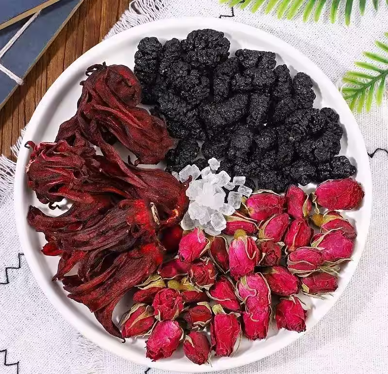 食材: 烏梅2顆,桑葚干一小把(約15克),洛神花2-3朵。