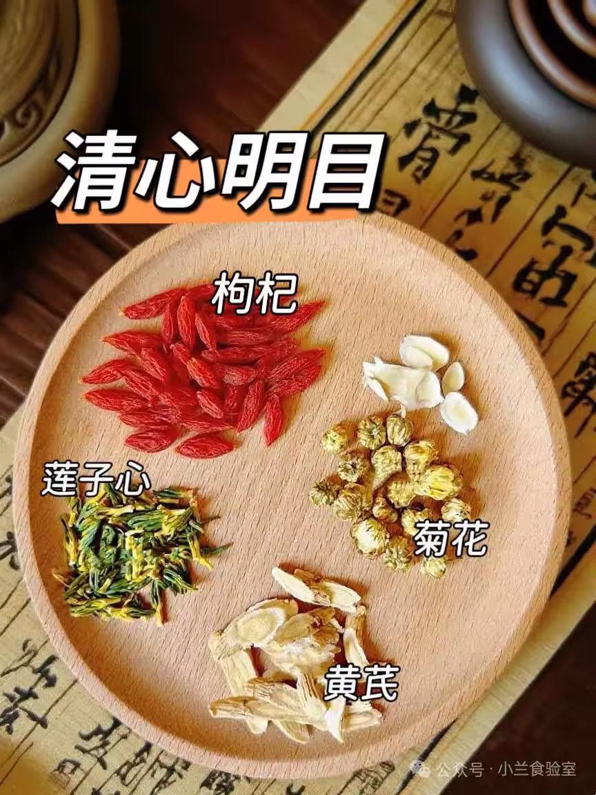 枸杞🍃 10克、菊花🌸 10克、黃芪🌿 10克、蓮子心🌿 5克。