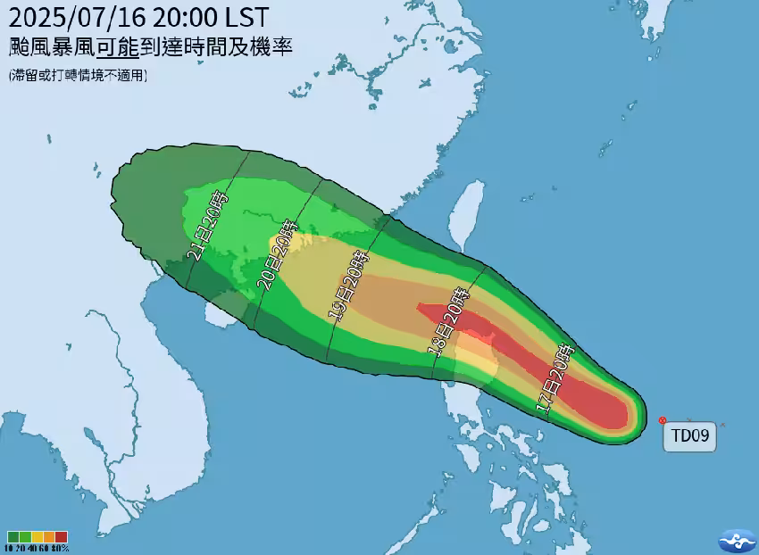 20日颱風將漸往港澳南方海域移動,但台灣仍會受到其外圍環流東南風影響。