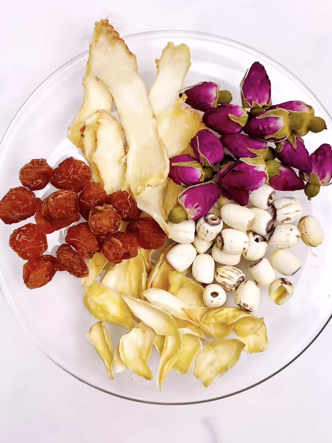 -食材:玫瑰4-5朵、玉竹15克、蓮子20克、桂圓5-6顆、百合8克