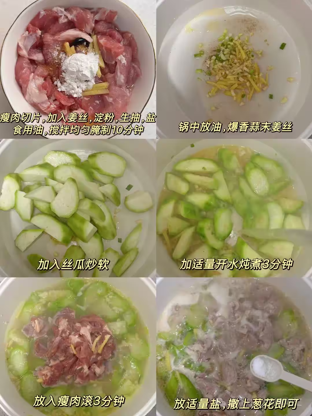 食 材 瘦肉、絲瓜、薑絲、蒜末、澱粉、生抽、鹽、食用油、蔥花 做 法 1. 瘦肉切片,加薑絲、澱粉、生抽、鹽、食用油,拌勻腌制 10 分鐘 。