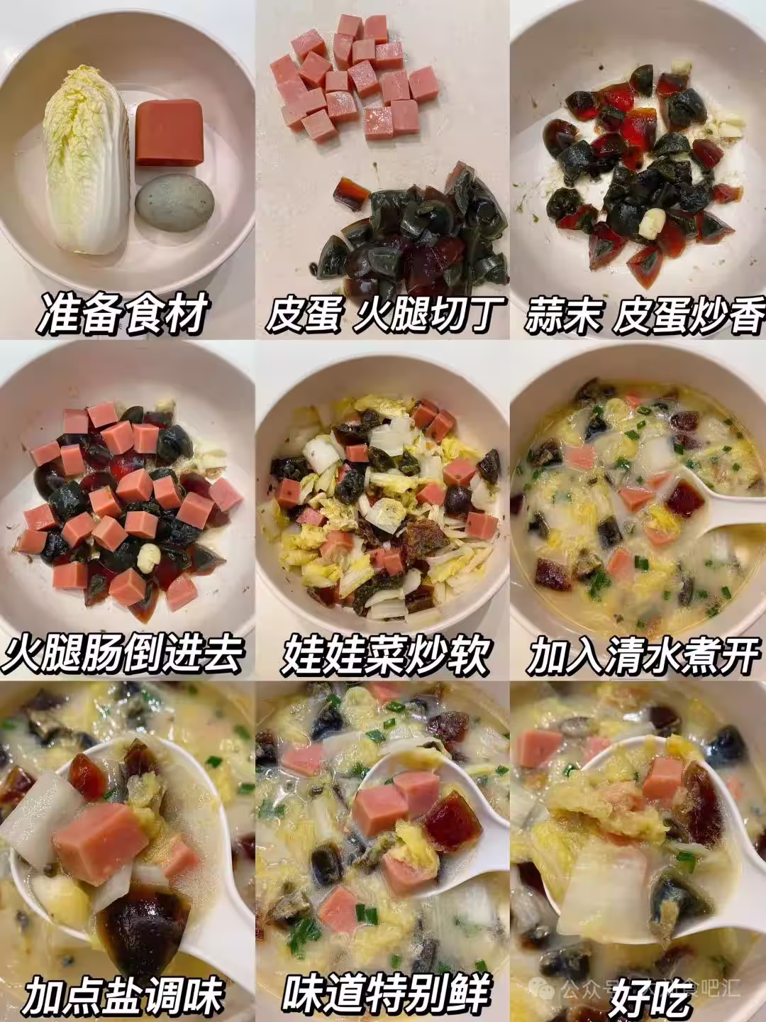 食 材 娃娃菜、皮蛋、火腿、蒜末、鹽 做 法 1. 皮蛋、火腿分別切丁;鍋中放少許油,蒜末爆香後,倒入皮蛋丁翻炒出香。 2. 加入火腿丁一同翻炒,再放入娃娃菜,翻炒至菜葉變軟。 3. 倒入適量清水,大火煮開後轉小火,煮幾分鐘讓食材入味,最後加鹽調味即可