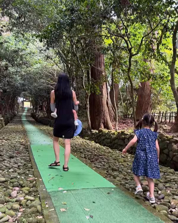 7月17日清晨,陳法拉在社交平台分享多張子女的背影照,以及她懷抱兒子與女兒在公園散步的照片。----------