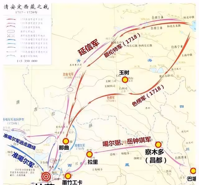 說回軍事,康熙收拾準噶爾那場仗,真是關鍵中的關鍵。1719年到1720年這段時間,清軍入藏的行動值得細說。