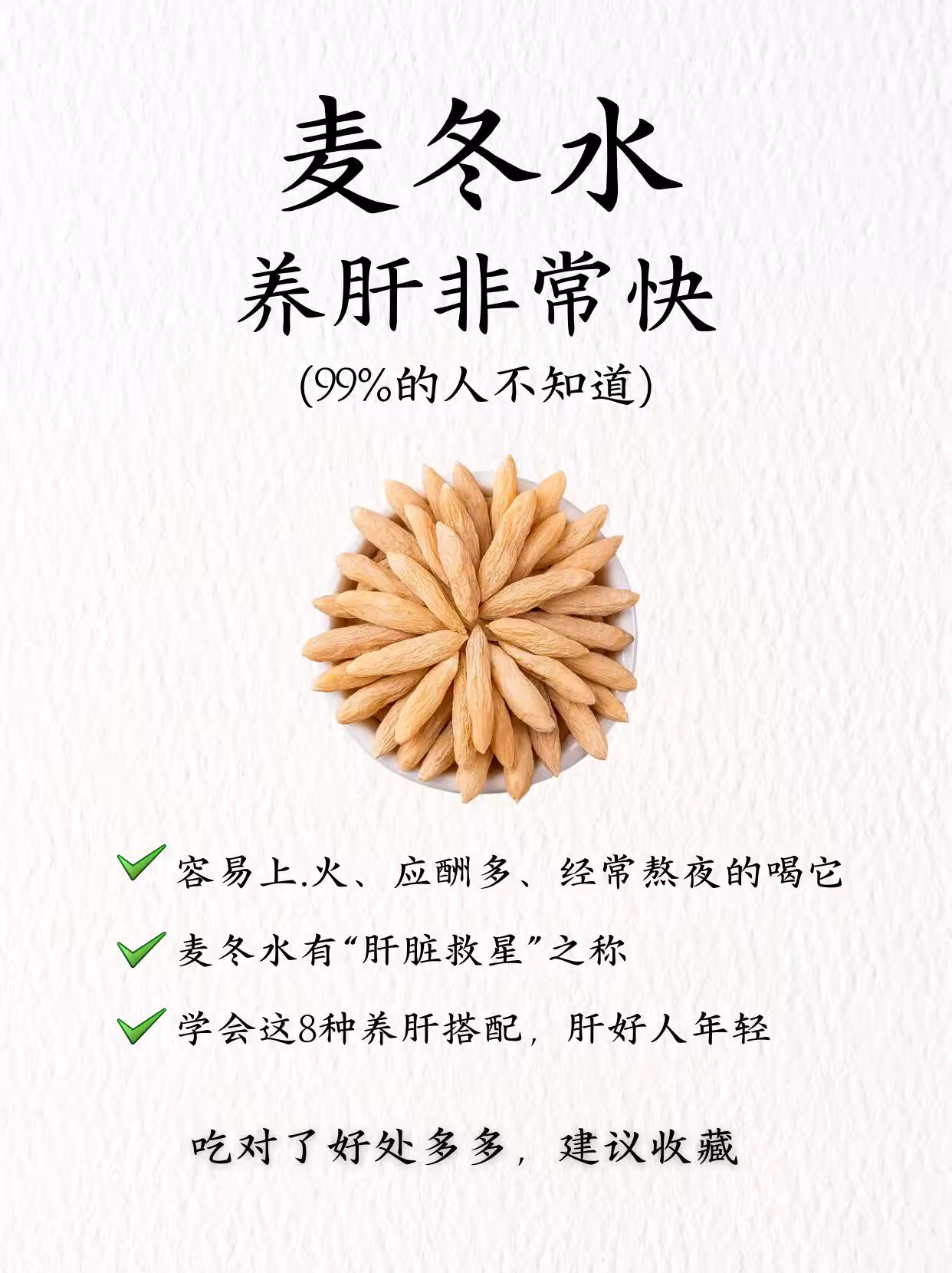 👉 麥冬水,它性質微寒,味道甘甜,泡水喝能滋/陰潤/燥,潤/肺止ke,對肝/髒特別友好!都說養肝等於養命,不妨從一杯麥冬水開始!