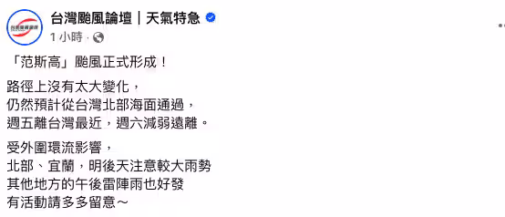氣象專家林得恩也在臉書粉專「林老師氣象站」以「颱風窩,大爆發」為題寫下,原於昨日中午生成的TD10,在環境駛流場的導引下,持續往西北方向移動,由於環境海溫約為攝氏30度左右,加上高層大氣也有顯著的赤道向外流,提供有利系統發展的條件,TD10最快在今日下午,就有機會增強為今年第7號颱風「范斯高」。