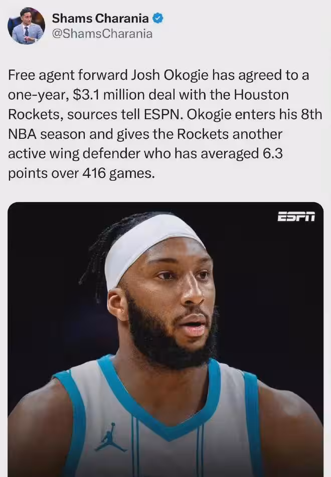 爆料王Shams:火箭一年310萬美元,簽約3D側翼奧科吉。