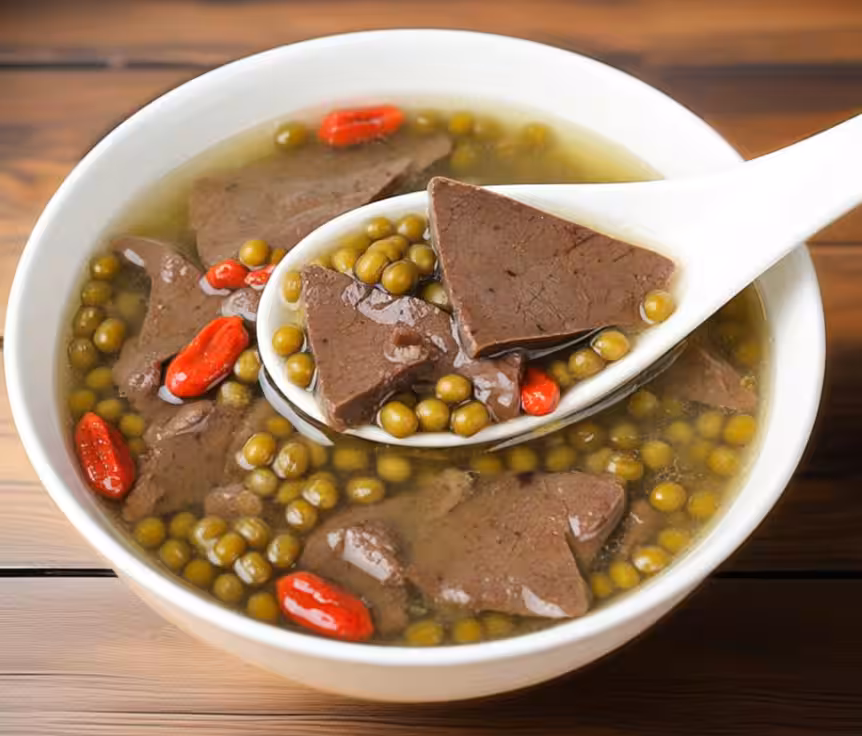 【功效】綠豆清熱解毒,豬肝富含鐵和維生素A,兩者搭配可促進肝臟排毒,改善貧血引起的面色蒼白,尤其適合長期用眼、熬夜人群。 【食材】