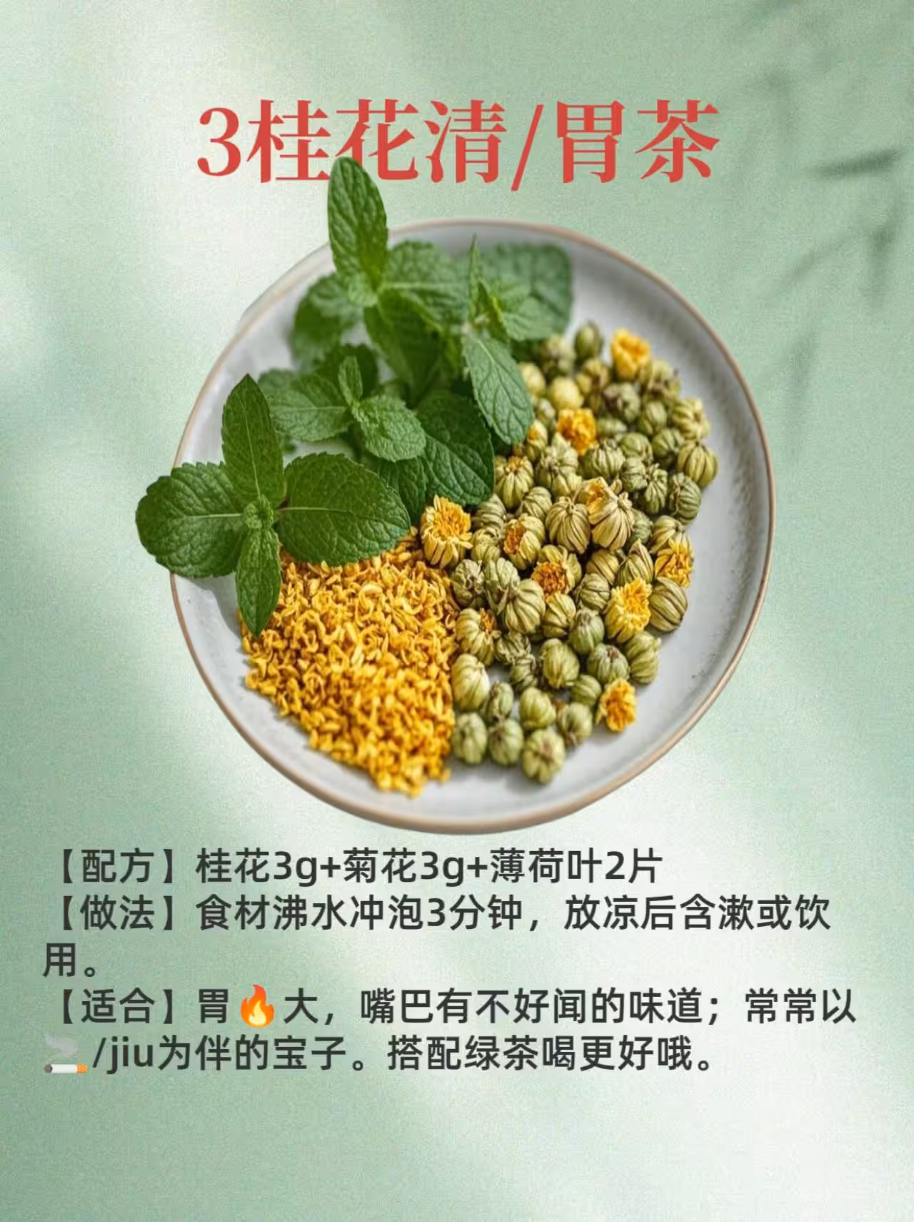 🍵桂花清/胃茶:嘴巴有異味、胃🔥大的寶子,試試這款清/胃茶。桂花、菊花、薄荷葉沸水沖泡,放涼後含漱或飲用,清新口氣,🚬/jiu帶來的不適輕鬆趕走~
