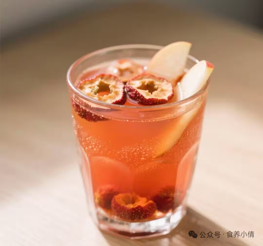 食材:蘋果1個(去核切塊)、干山楂片5-6片、陳皮一小瓣(約3克)、去核紅棗3顆、清水1000毫升。