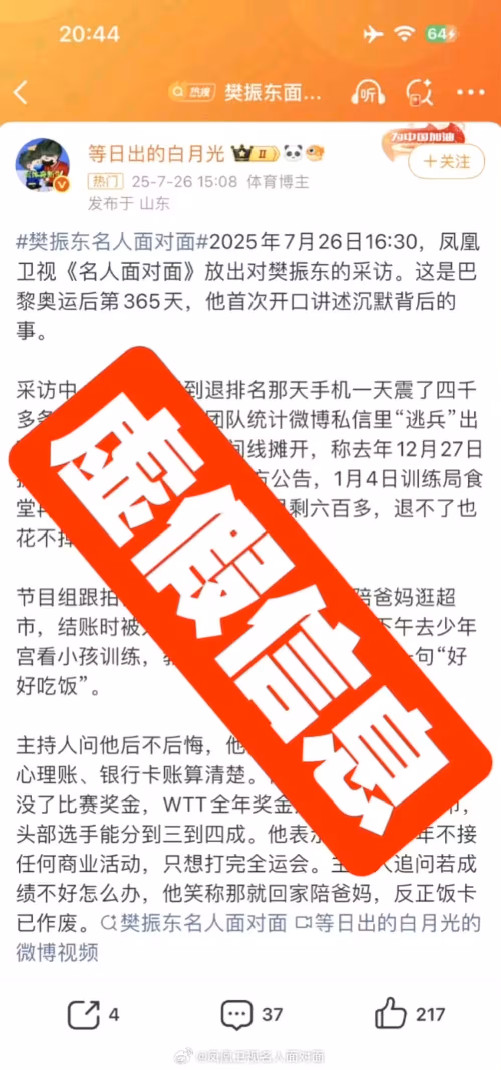 該帳號造謠稱:所謂的「樊振東」說在退出世界排名之後,自己的訓練局飯卡就作廢了,裡面有600多塊錢,既退不了,也花不了。「樊振東」還說,不後悔退出世界排名,只是想把身體帳、心理帳、銀行卡帳算清楚。