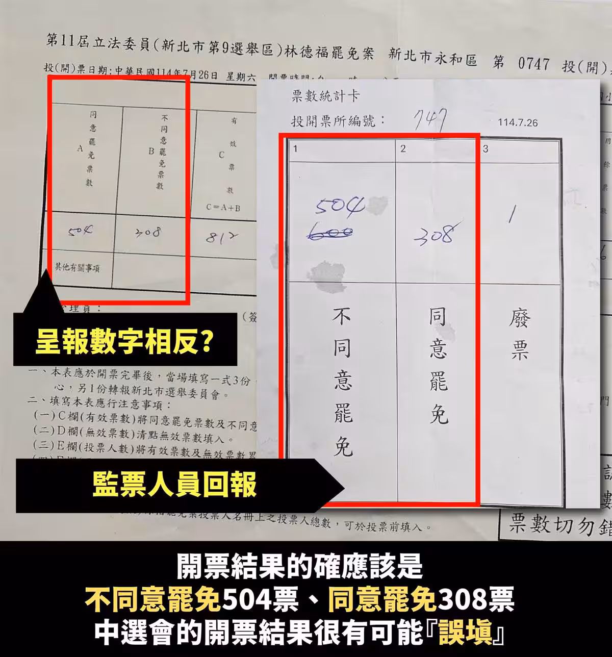 首波大罷免以「25:0」落幕,但國民黨立委林德福今(29日)表示,新北市第9選區光復里同意罷免票為504票,「大於」不同意罷免票的308票,但被誤植為不同意罷免504票、同意罷免308票,然他們向選委會反映,卻反被要求要「自行舉證」。林德福表示,追根究底,中選會需要通盤檢討票務作業。