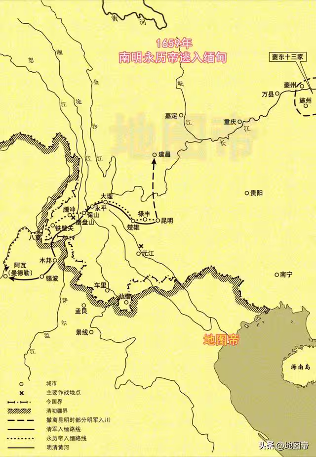 1661年(清世祖順治十八年、南明昭宗永曆十五年),吳三桂出兵緬甸,逼迫緬甸國王莽達交出永曆帝朱由榔,南明亡。