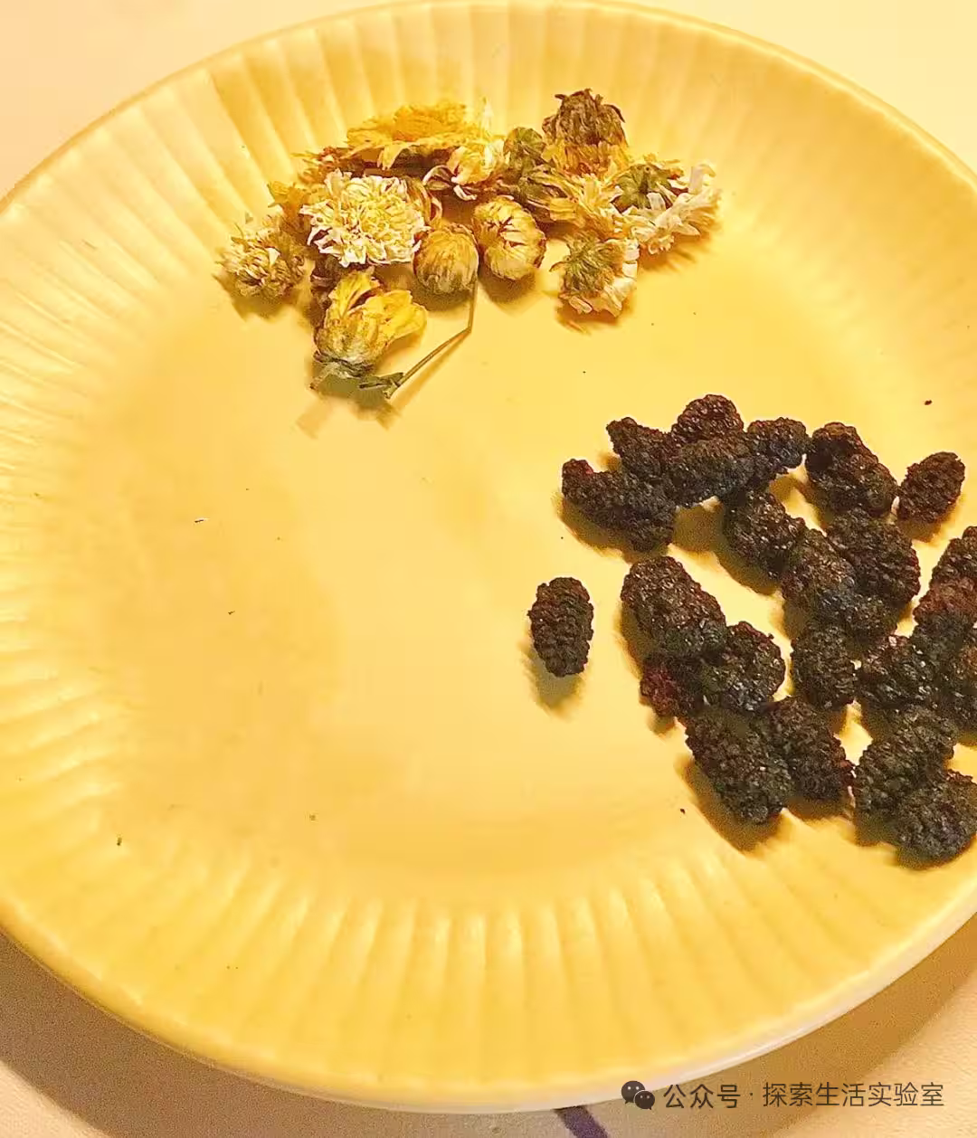 1️⃣干桑葚泡洗乾淨;菊花用清水沖一下(別泡,香味會跑);