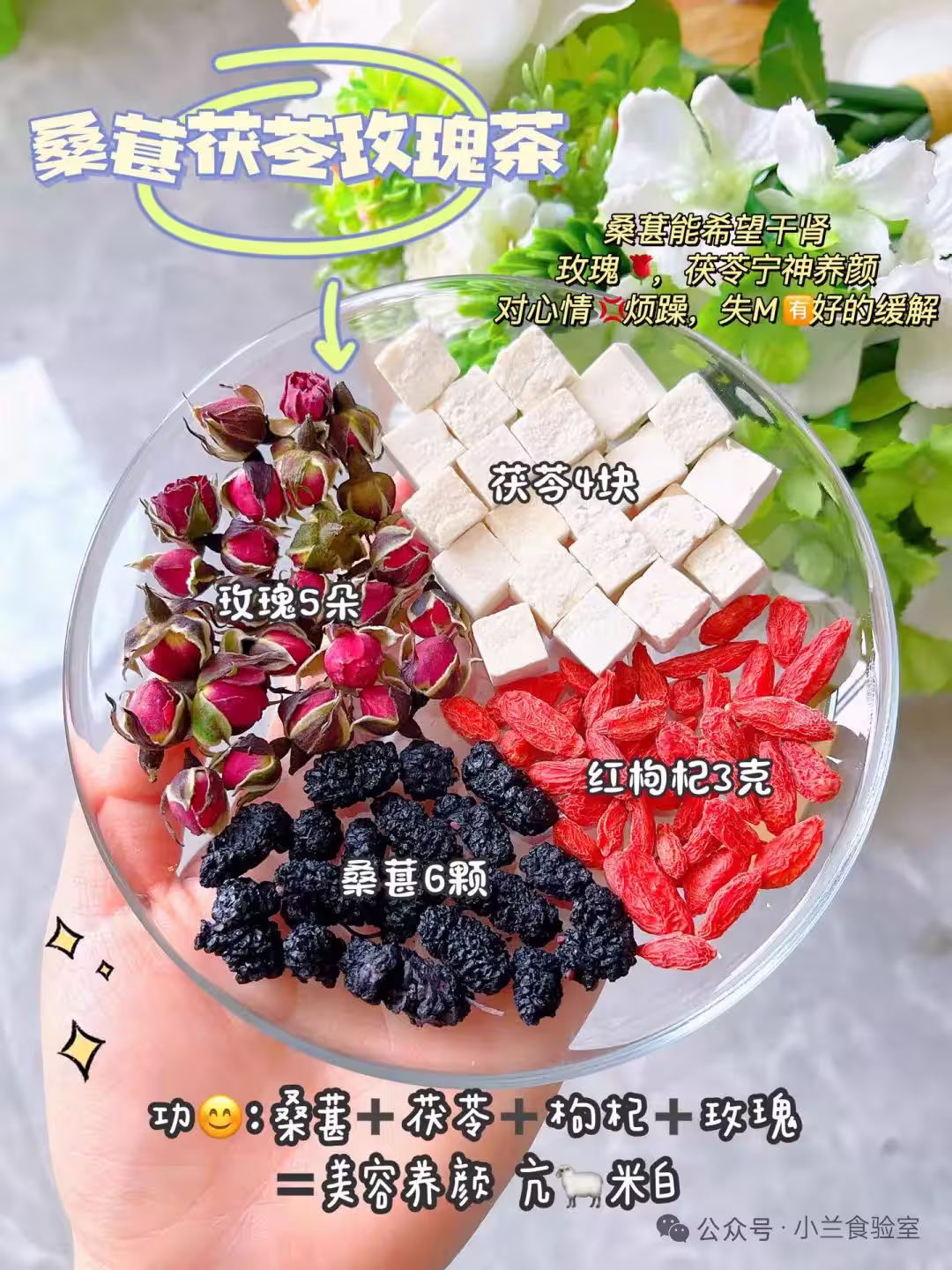 1. 準備食材:稱量茯苓4塊、玫瑰5朵、紅枸杞3克、桑葚6顆。茯苓塊較大,可稍壓碎以釋放成分。