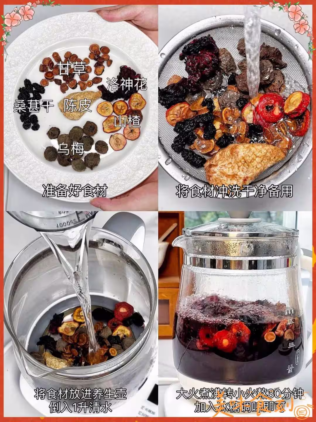 烏梅20克+山楂15克+陳皮5克+桑葚干10克