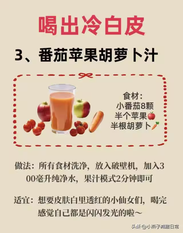 適合:想白到發光的小仙女!番茄的維C+胡蘿蔔的β-胡蘿蔔素,喝著喝著就白裡透紅,陽光底下都在發光!