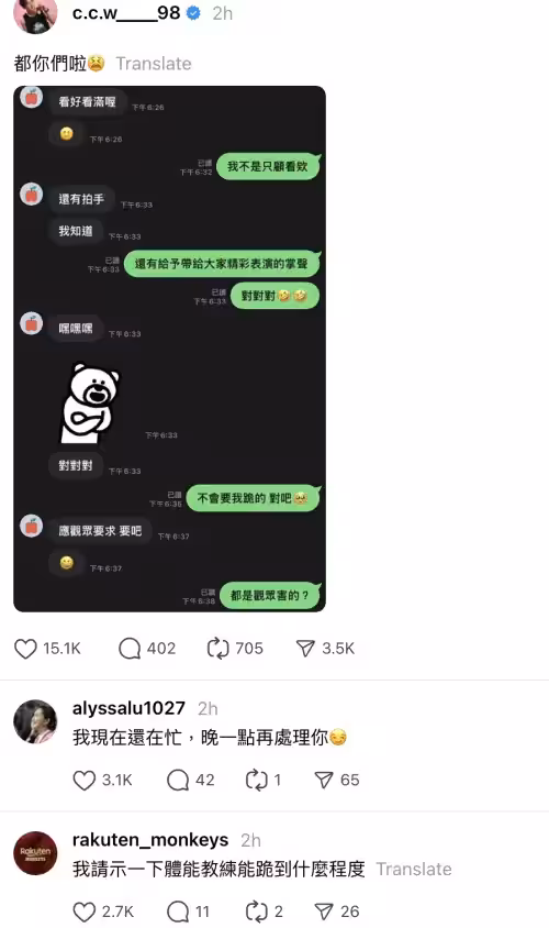▲陳晨威事後遭到球團已經經紀人乖姐出征,笑翻網友。(圖/Threads @c.c.w____98)