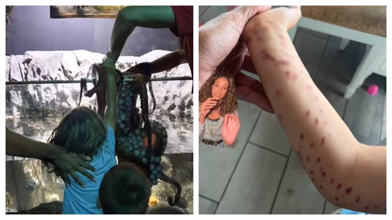 讓媽媽傻眼的是,館方完全不當一回事,還出言譏笑,最後出動了3個大人合力才把章魚從男童手上拉開,但他的手上已留下許多紫色瘀青和吸盤印記,真的怵目驚心,事實上不只男童就連飼養員也曾被章魚吸盤緊吸巴著不放。水族館飼養員:「噢這真是嚴厲的愛。」