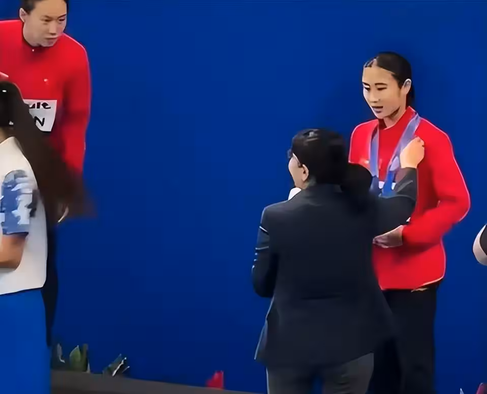 周姐身為跳水隊的主教練,剛剛為大家頒獎,沒想到竟然出了個不大應該出的小差錯。