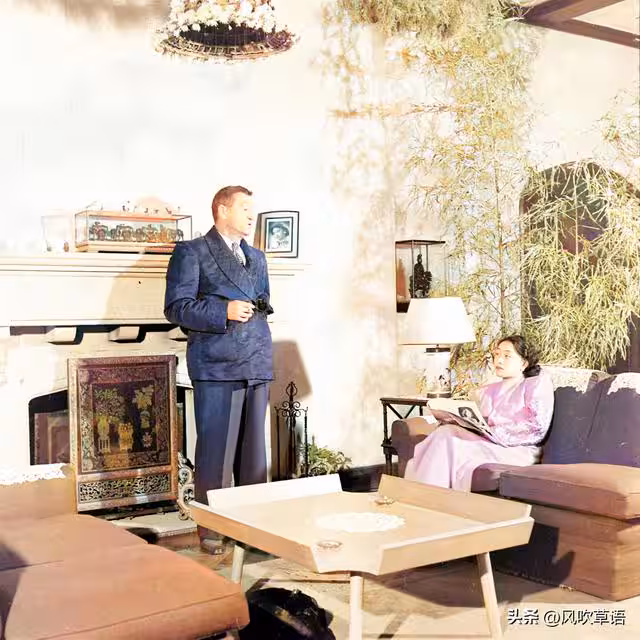 次日早餐,攝影師伯恩斯繼續記錄兩人的新婚生活。兩人都還穿著睡衣,陳香梅靠在沙發上,手裡拿著《生活》畫報,一副慵懶的模樣。