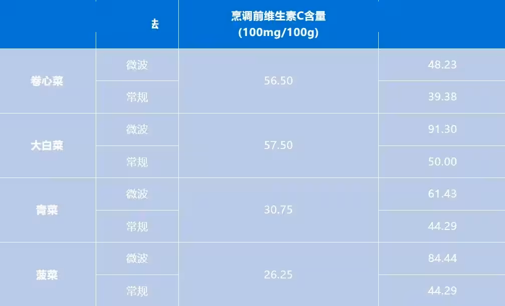 水溶性維生素,如維生素C、維生素B等的流失與烹調方式中加水量有關,微波烹調因無需加水或只加少量水可以較好的保留食物中水溶性維生素。