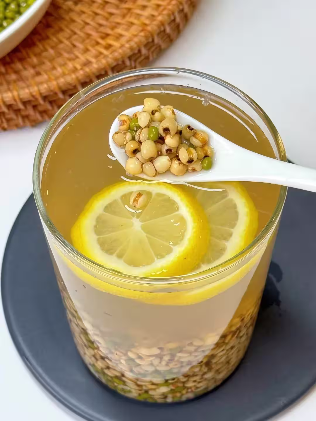 掀開蓋子,湯水是淡淡的黃綠色,煮開的綠豆微微開花,炒過的薏米沉在鍋底。第一口下去,有炒穀物的焦香墊底,接著是綠豆的清潤,最後舌尖留下檸檬那一點微酸的回味,不澀口,很解膩。