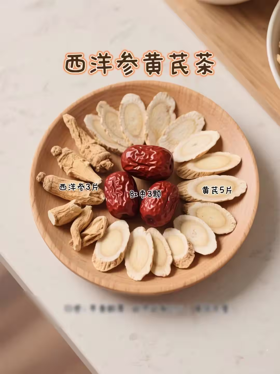 拿三片西洋參、五片黃芪,再放兩顆洗乾淨的紅棗。放進杯子裡,沖入滾燙的開水,蓋上蓋子燜十分鐘左右,顏色變得清亮溫潤就能喝了。