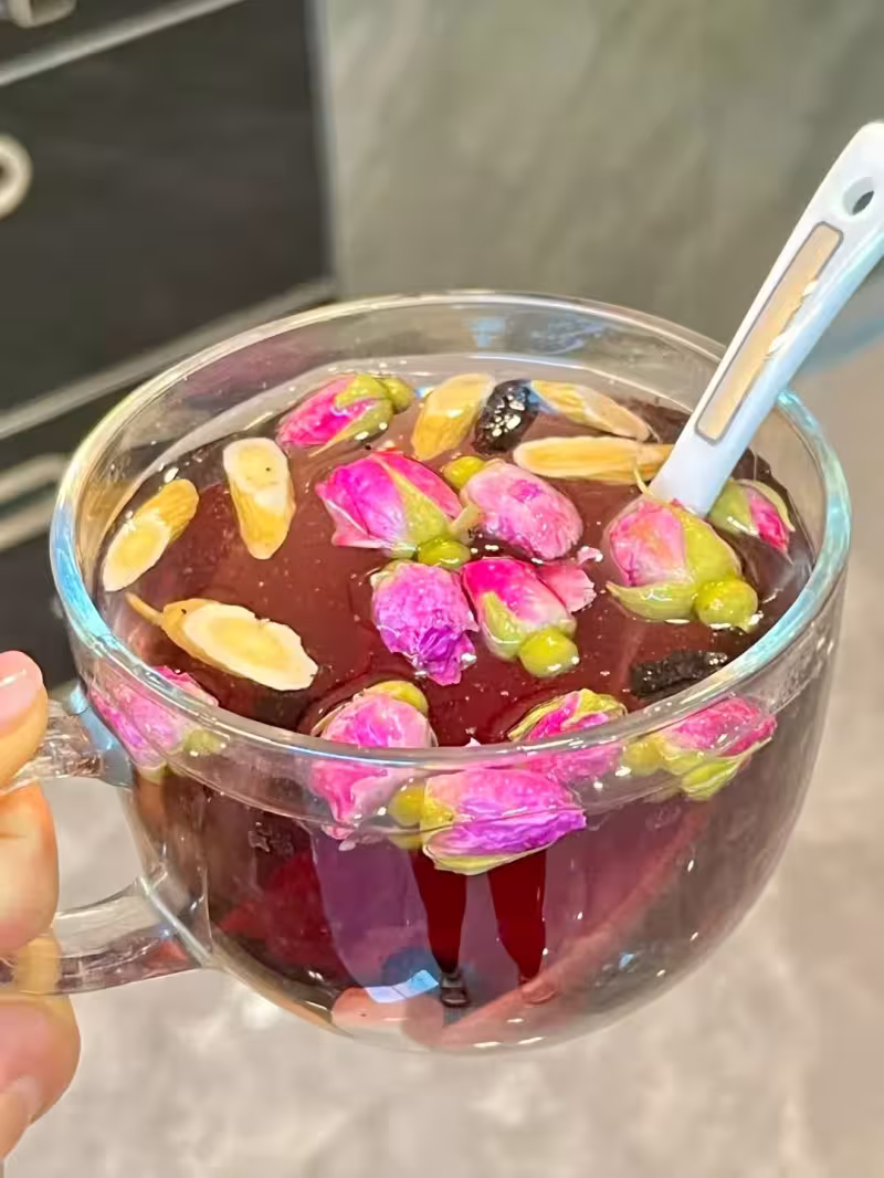 煮的時候,黃芪和茯苓的味道最先飄出來,是種乾淨的植物氣息。桑葚放下去沒多久,鍋里的水就慢慢染上了溫柔的紫紅色。玫瑰花在水裡重新舒展開,香氣一點點融進去。