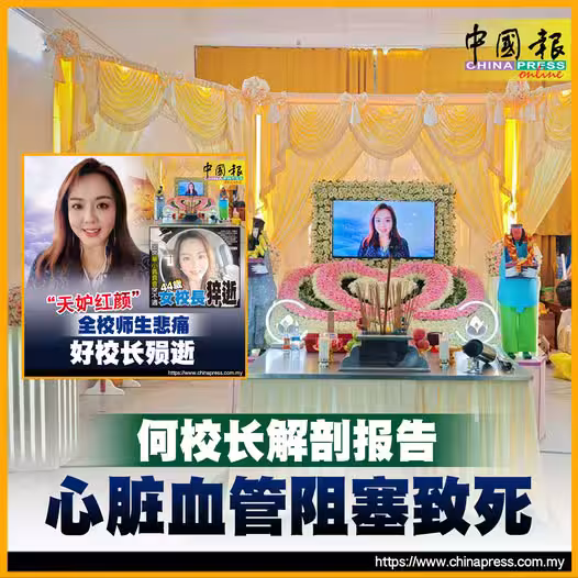 (淡邊18日訊)昨日在校園舉行義賣會時,昏厥後不幸逝世的森美蘭利民濟義樂新村華小何雯鳳校長,根據初步了解,解剖報告顯示,何雯鳳校長的死因,因心臟血管阻塞所引發。