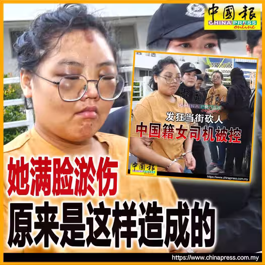 涉嫌持刀隨機攻擊人的中國籍女司機,今日被控2項罪名,她被押上加影法庭時,可見頭部和眼部出現瘀青傷勢。