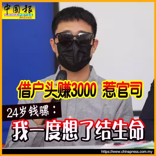 (檳城20日訊)因為3000令吉借出銀行戶頭給朋友,24歲麵攤助手成為錢騾,大半年來因被提控10項以上的罪名,奔波全馬,一度更曾想了結生命。