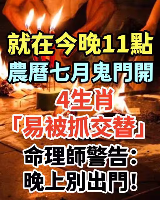 就在8月22日晚上11點,農曆七月鬼門開「4生肖易被抓交替」⚠️ 命理師警告:晚上別出門!農曆七月初一「鬼門大開」,俗話說「鬼月不宜夜遊」,這一天陰氣特別重,陽氣弱的人容易受到干擾。