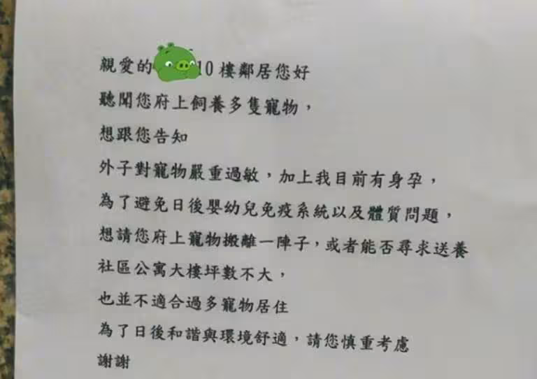 根據媒體《三立新聞網》、《TVBS》的報導,一名網友在臉書PO出一張公告,內容是一位鄰居寫給他的通知,對方表示自己的兒子因為對寵物嚴重過敏,再加上自己又懷孕,得知他家中飼養了不少寵物,擔心日後會對嬰幼兒體質和免疫系統造成影響,因此要求他將寵物搬離或送養,還強調「公寓大樓坪數不大,不適合過多寵物居住,為了日後和諧與環境舒適,請您慎重考慮!」