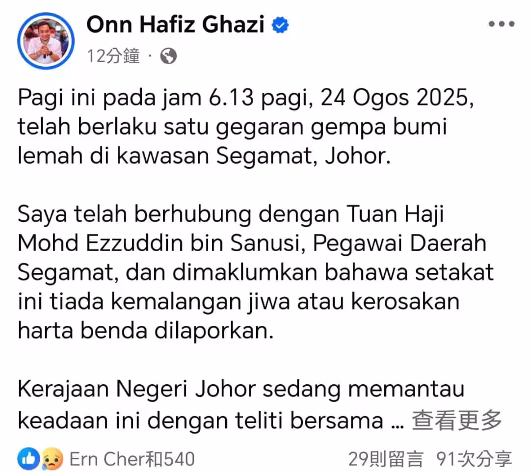 柔大臣翁哈菲茲在面子書證實柔州昔加末發生地震。