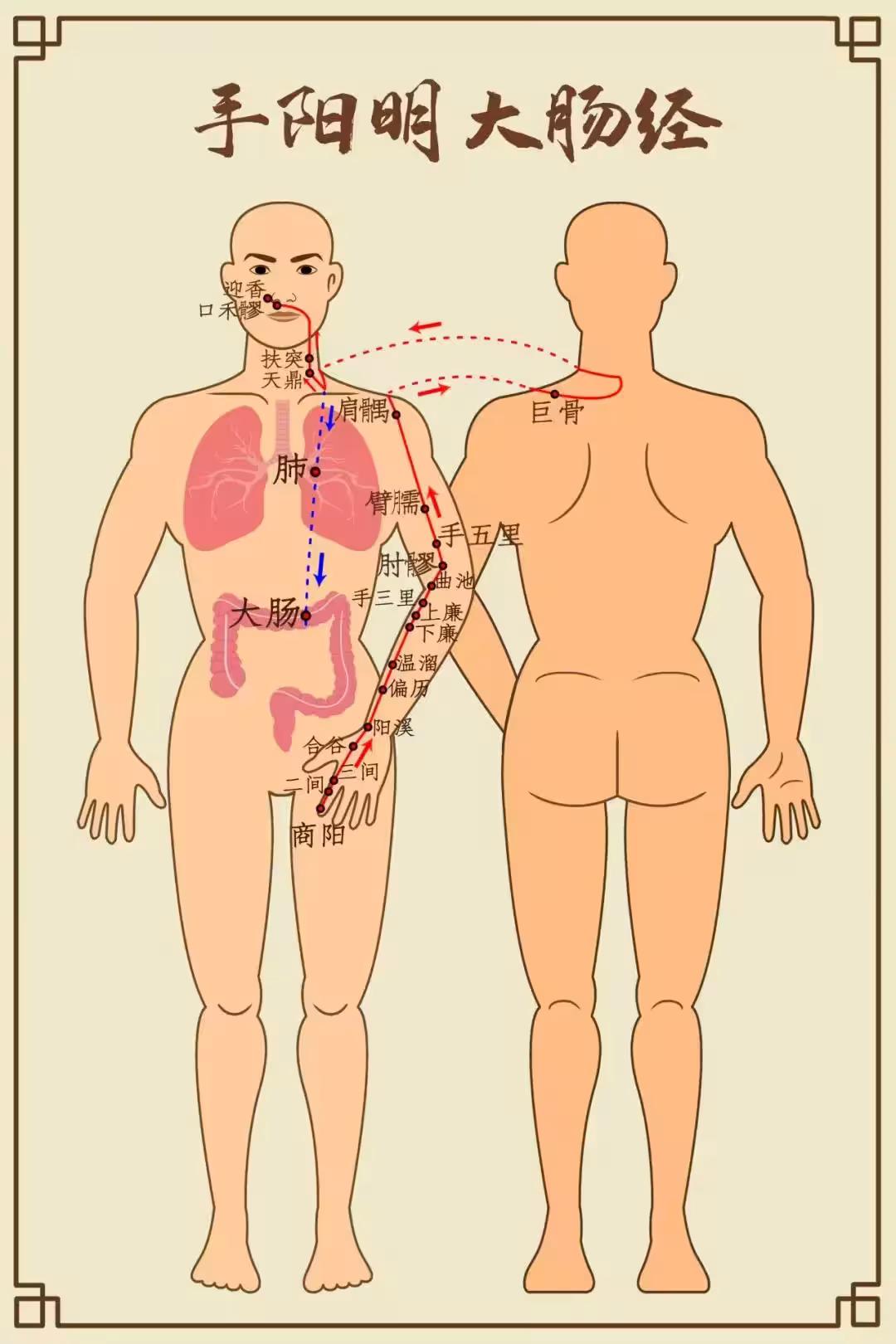 敲大腸經對老年人還有額外的好處。因為大腸經屬於多氣多血之經,如果老年人覺得肩膀老痛,經常敲敲大腸經,肩膀的氣血就會充足,這對於防治肩膀痛很有好處。簡單地說就是敲打胳膊正面。
