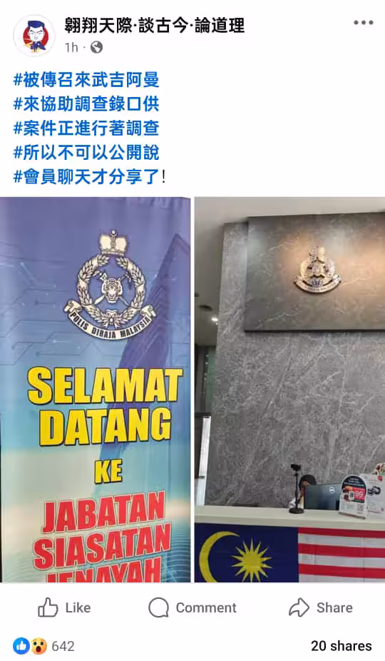 他在帖文以全文標籤的方式,指其被傳召到武吉阿曼警察總部錄取口供,而相關案件已正在調查,惟不可以公開說明緣由。