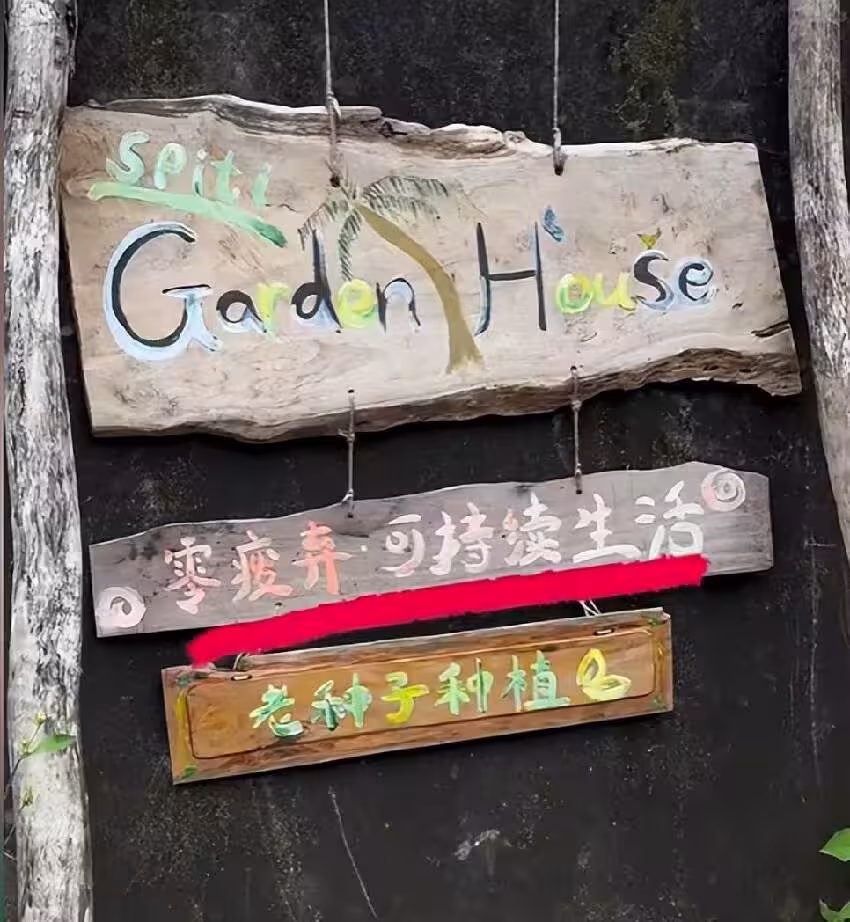 院子不大,但非常整潔,門口還放著三塊牌子,上面寫著「零荒廢,可持續生活」。