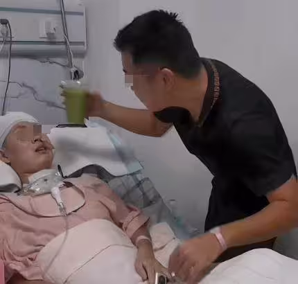 回到病房,他又小心地把食材洗凈、切塊,放進破壁機里打成細細的糊狀,再通過食管導管,一點點喂給妻子。