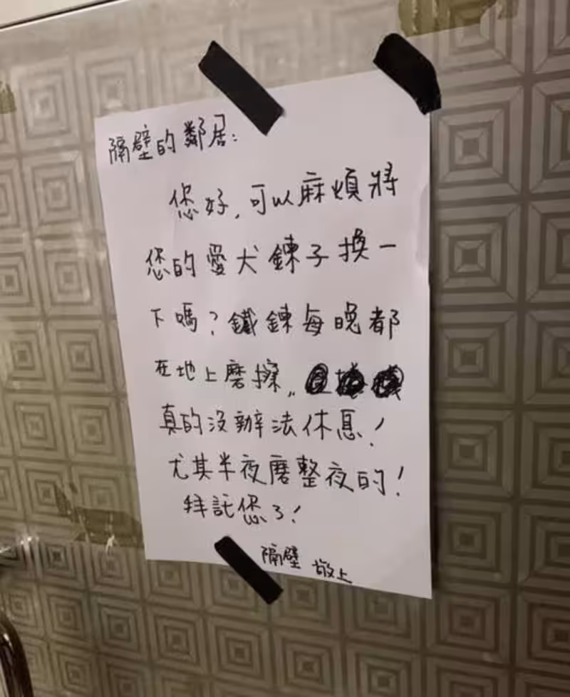 鄰居每晚傳鐵鏈聲!正妹失眠留紙條「愛犬鏈子換一下」,隔天「被反嗆1句」她傻眼了