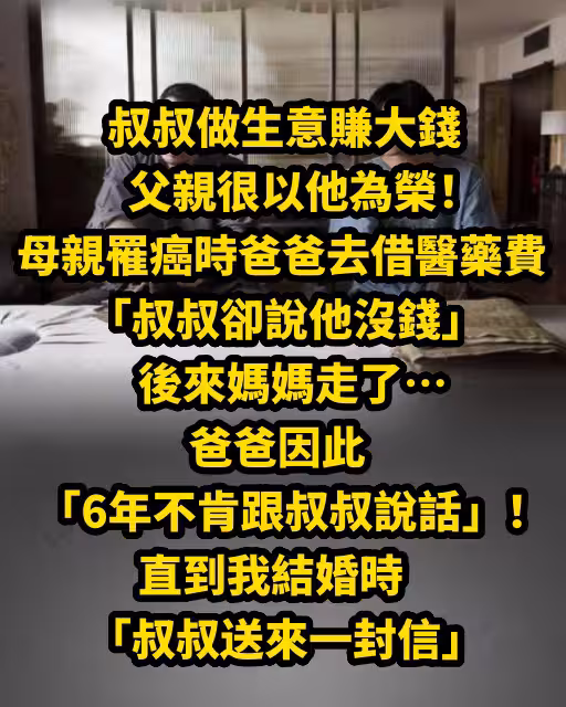 叔叔做生意賺大錢父親很以他為榮!母親罹癌時爸爸去借醫藥費「叔叔卻說他沒錢....」後來媽媽走了… 爸爸因此「6年不肯跟叔叔說話」!直到我結婚時「叔叔送來一封信」