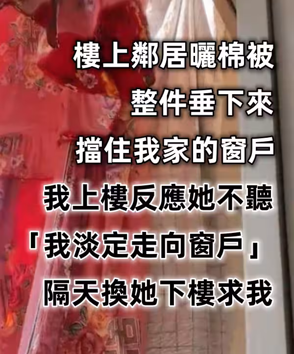 樓上鄰居曬棉被「整件垂下來擋住我家的窗戶」!我上樓反應她不聽「我淡定走向窗戶...」隔天換她下樓求我