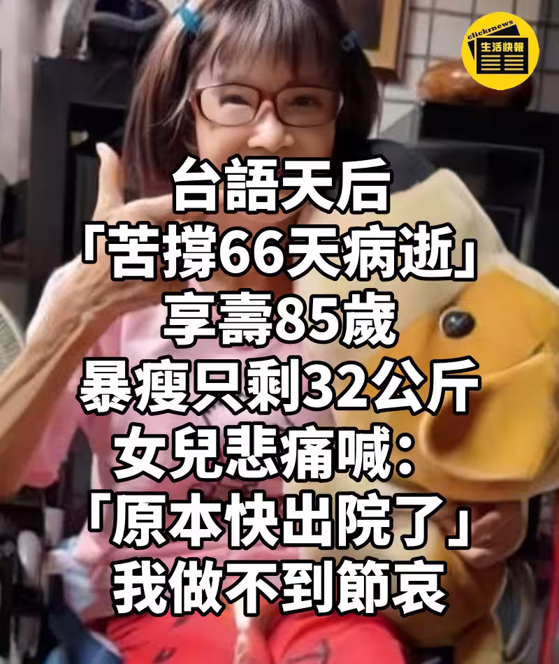 台語天后「苦撐66天病逝」 享壽85歲,暴瘦只剩32公斤,女兒悲痛喊「原本快出院了」:我做不到節哀