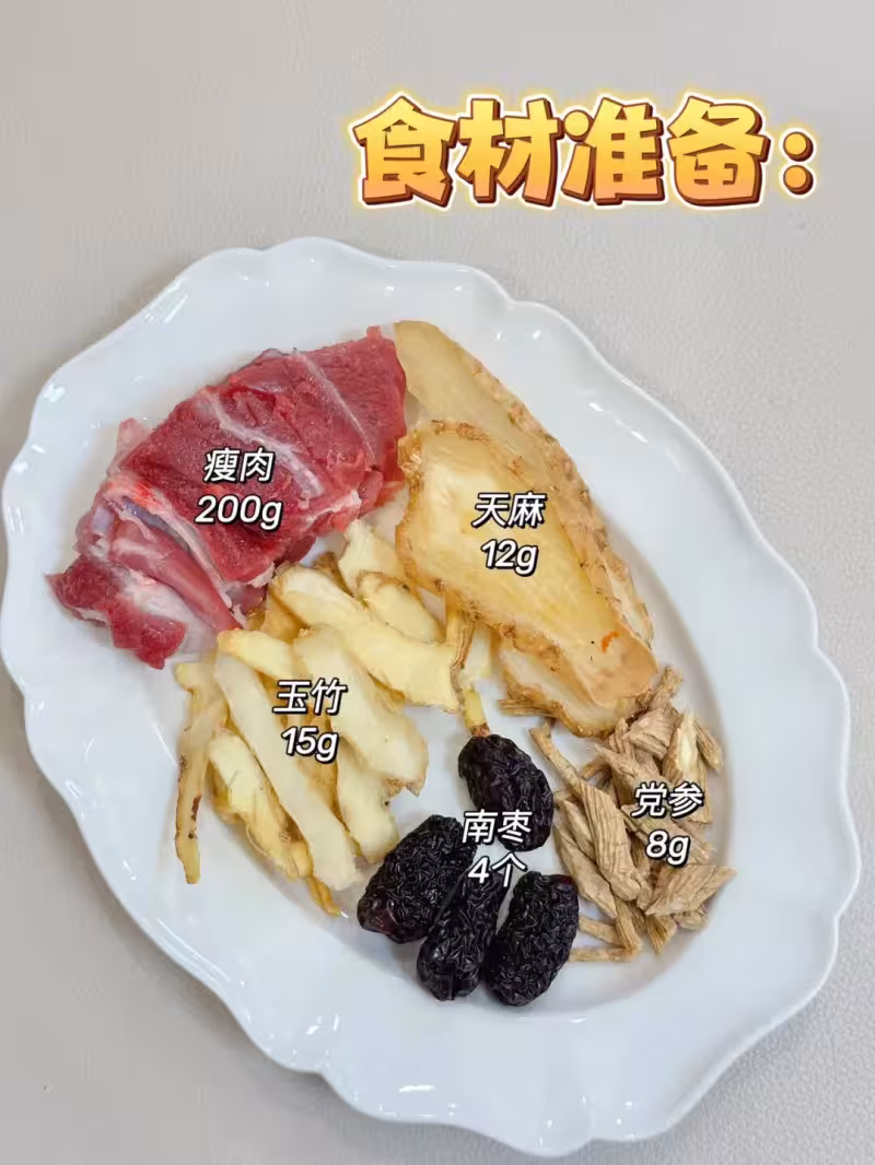天麻12g、黨參8g、玉竹15g、南棗4個、瘦肉200g