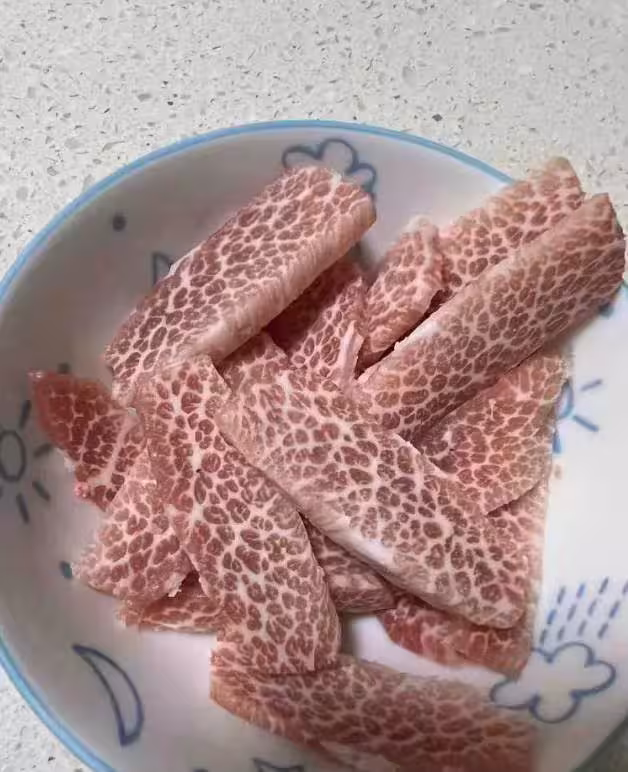 去菜場要了豬肉炒菜,切開一看差點把刀丟了,感覺是豬頸肉淋巴肉,我剛想丟到垃圾桶,老公一把拉住我,別丟,豬身上沒那麼點。