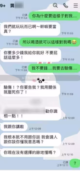 此時女方喊「我不要錢…我要去驗傷!」男方再嗆「驗傷!你要告我?我用關係就壓死你了!」他還勸女方識相一點,「我跟你講啦,我根本就不用跟你談,我會請人跟你談你懂我意思嗎?你現在沒有選擇的餘地懂嗎?」語氣非常逼人。