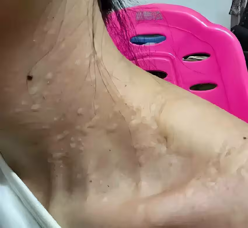 她猛地坐起身,打開燈一看,脖子上已經紅了一大片,而且越來越癢,甚至人中和下巴也開始紅腫!