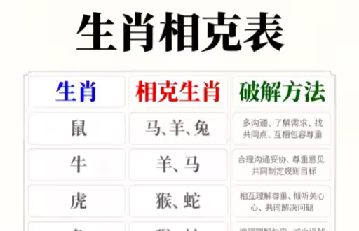 下面將為大家介紹一下12生肖相剋表和如何破解生肖相剋的方法。