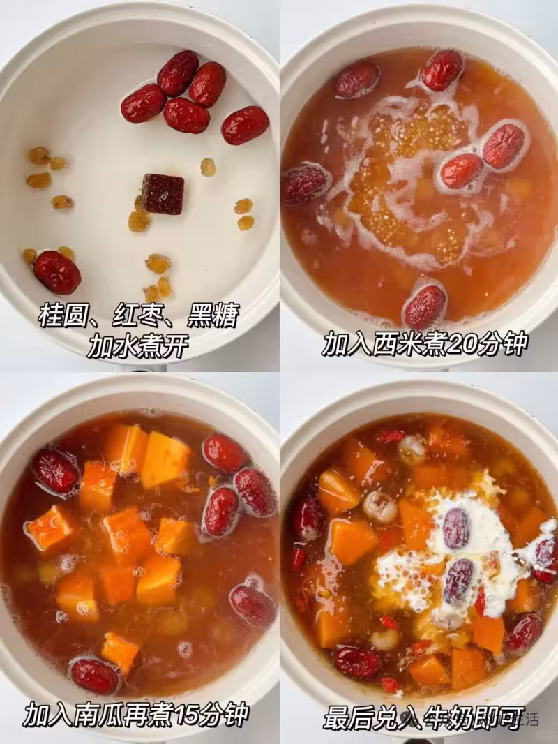 桂圓、紅棗、黑糖、西米、南瓜、牛奶